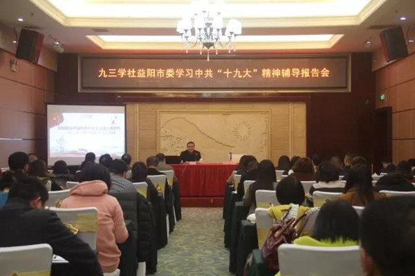 三湘统战网11月28日讯(通讯员 皮艳玲 李序曲)11月24日下午,九三学社益阳市委组织学习中共“十九大”精神报告会。益阳市政协副主席、九三学社益阳市委主委高德文主持会议,中共益阳市委讲师团主任曹超军应邀作辅导报告,九三学社益阳市委全体班子成员、各基层组织班子成员及骨干社员110余人参加学习。