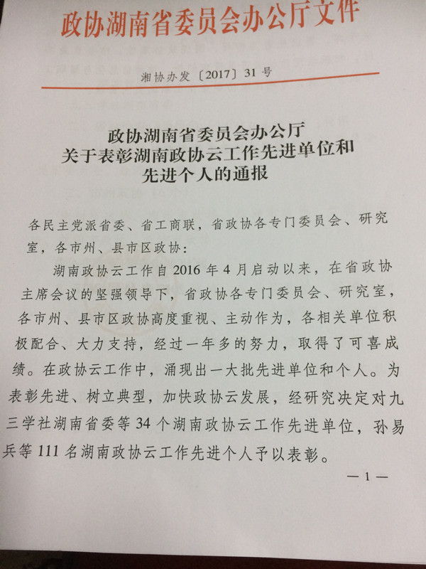 三湘统战网11月29日讯(通讯员 皮艳玲)11月28日上午,湖南省政协召开湖南政协云工作座谈会。会议表彰了为推动政协云工作而做出了突出成绩的34个先进单位和111名先进个人,九三学社湖南省委荣获湖南政协云工作先进单位称号,九三学社湖南省委宣传联络处皮艳玲同志荣获湖南省政协云工作先进个人称号。