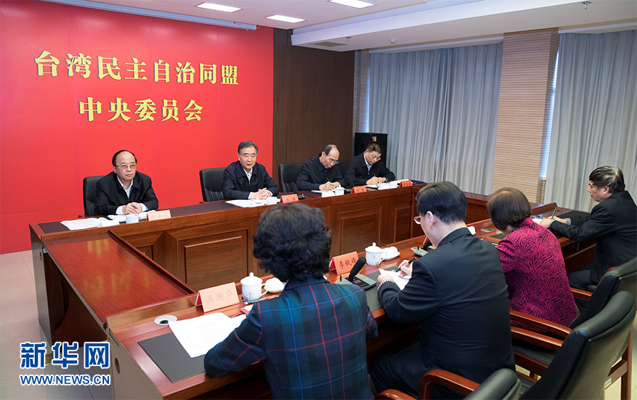 近日,受习近平总书记委托,中共中央政治局常委、全国政协主席汪洋代表十九届中共中央,逐一走访各民主党派中央和全国工商联,并同各民主党派中央和全国工商联的领导班子成员座谈。这是3月22日,汪洋走访台盟中央并同领导班子成员座谈。新华社记者 王晔 摄