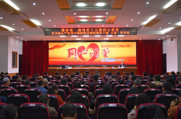 统一战线同心讲堂由省委统战部主办,各民主党派省委、省工商联协办,省社会主义学院承办,省委统战部在长沙的部领导、省社会主义学院领导班子成员及省直统一战线学习贯彻党的十九大精神专题研讨班全体学员280多人参加。