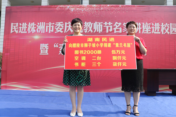 郝建东表示,民进作为联系教育界知识分子为主的参政党,对教育有着一份天然的情愫与担当,为办好此次“民进株洲市委庆祝教师名家讲座暨‘素兰书屋’捐赠仪式”活动,会市委通过前期调查和摸底,了解到狮子坡小学没有阅览室的情况,经与民进省委协商,决定将湖南省第四所“素兰书屋”落户于此,会市委也从办公经费中拿出1万5千元为书屋配置了空调和书柜,这也是民进持续关注、支持教育事业的又一次具体行动。