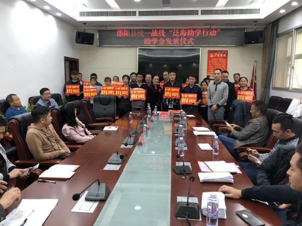 10月10日,邵阳县举行统一战线“泛海助学行动”助学金发放仪式,313名贫困学生每人获5000元助学金。县人大常委会副主任、工商联主席蒋梅娥,县委统战部、县教育局、县扶贫办相关领导,乡镇场政协主任,以及部分学生、家长代表参加仪式。