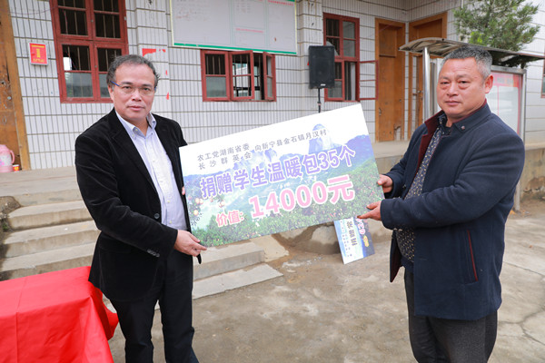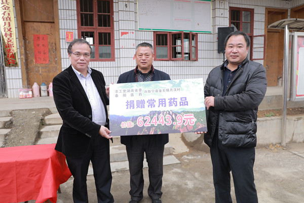 11月20日,湖南省政协副主席、农工党湖南省委主委张灼华赴新宁县调研,了解脐橙产业发展情况,为脐橙产业发展支招,并在金石镇月汉村开展扶贫捐赠活动。活动现场,农工党省委联合湖南省广播电视局、湖南泰阳医药发展有限公司、长沙群英会向金石镇月汉村捐赠了总价值12.6万余元的药品、图书和学生温暖包。