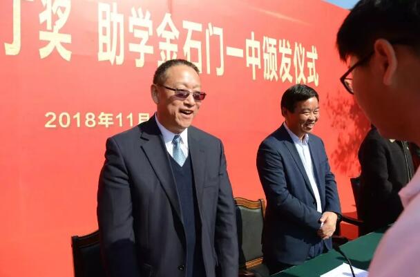 郑建邦(左一)、何报翔(左二)出席“郑洞国教育基金”石门一中园丁奖、助学金颁发仪式