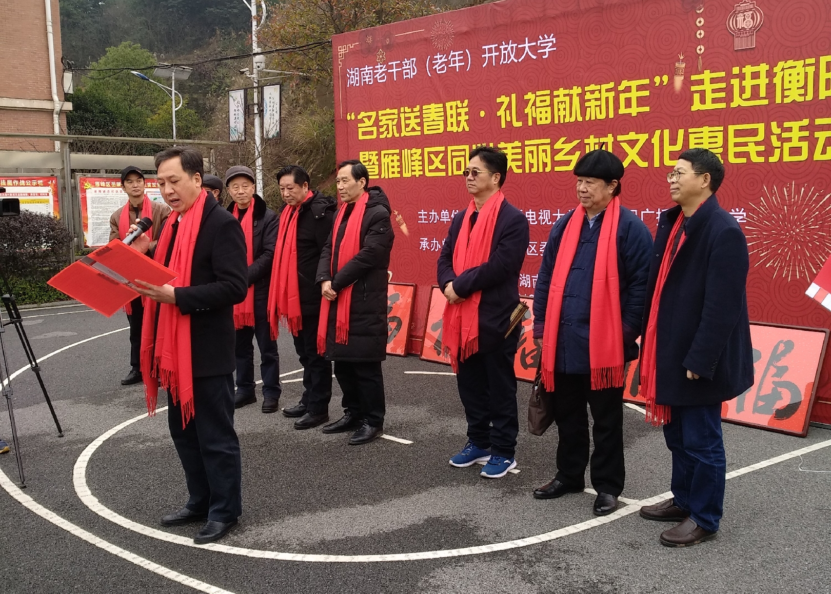 三湘统战网1月23日讯(通讯员 王益军)1月21—22日,雁峰区委统战部联合湖南广播电视大学、衡阳广播电视大学、雁城书画院开展“名家送春联·礼福献新年”文化惠民、爱心助学活动走进文昌村、爱民社区,将党的十九大精神和中国优秀传统文化带进乡村、带到社区、带给居民,引导统一战线广大广大书法家用实际行动践行文艺服务人民、服务社会主义宗旨和坚定文化自信、推动文化繁荣,用传统国学和优秀文化助力同心美丽乡村(社区)建设。衡阳市委统战部副部长、市侨联党组书记张永英,衡阳广播电视大学校长黄建国、副校长肖海源,雁峰区委常、宣传部长欧军林,雁峰区委常委、统战部长陈泰山等领导和村民(居民)代表150多人出席。