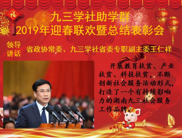 三湘统战网2月12日讯(通讯员 李成军)伸出援助之手,爱能创造奇迹,善举点亮希望,让爱穿越时空。2019年2月3日晚,九三学社助学群举行“2019年迎春联欢暨总结表彰会”。省政协常委、九三学社省委专职副主委王仁祥,九三学社省委社会服务处处长熊英出席活动。中国助学网湖南工作站站长熊湘波,联合赤道环境评价有限公司湖南分公司负责人粟爱民、副总工程师李锋,湖南中华职业教育社社会服务部部长谭圣林,中国助学网站长石建华,美中下一代教育基金会会长鲍俊涛,国礼书法家马君声,九三学社市委、省直支社负责人等爱心人士参加活动。