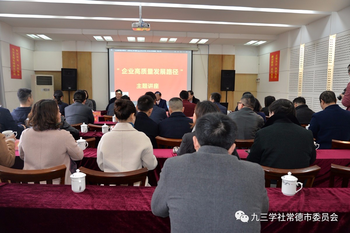 三湘统战网3月13日讯(通讯员 毛武 李成军)为更好的促进“九企合作”活动深入开展,助推合作企业高质量发展。3月7日上午,九三学社常德市委、市政协九三工作组特邀请九三学社湖南省委副主委、省政协经科委主任、中南大学商学院教授、博士生导师吴金明教授来常德作“企业高质量发展路径”专题讲座。九三学社常德市委主委呙滨辰,市委统战部副部长李学明,“九企合作”企业负责人和结对责任人、九三学社社内非公有制经济人士、社内人大代表、政协委员等50余人参加了活动。讲座活动由市委统战部副部长李学明主持。