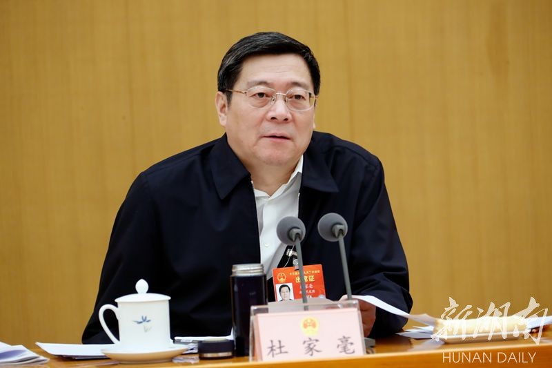 杜家毫说,“两高”工作报告坚持以习近平新时代中国特色社会主义思想为指导,总结成绩实事求是、分析问题深入透彻、部署工作重点突出,是两个高举旗帜、求真务实、彰显法治、改革创新的好报告,我完全赞成。过去一年,“两高”坚持党的领导,紧扣中心大局,坚持司法为民,全面改革创新,忠实履行宪法法律赋予的职责,各项工作取得新进展,有力推动了法治中国、平安中国建设进程。湖南省委将坚决贯彻党中央决策部署,支持司法机关依法独立公正行使审判权和检察权;支持省“两院”按照“两高”工作报告要求,抓好工作落实,全力服务保障全省经济社会持续健康发展和社会大局稳定。