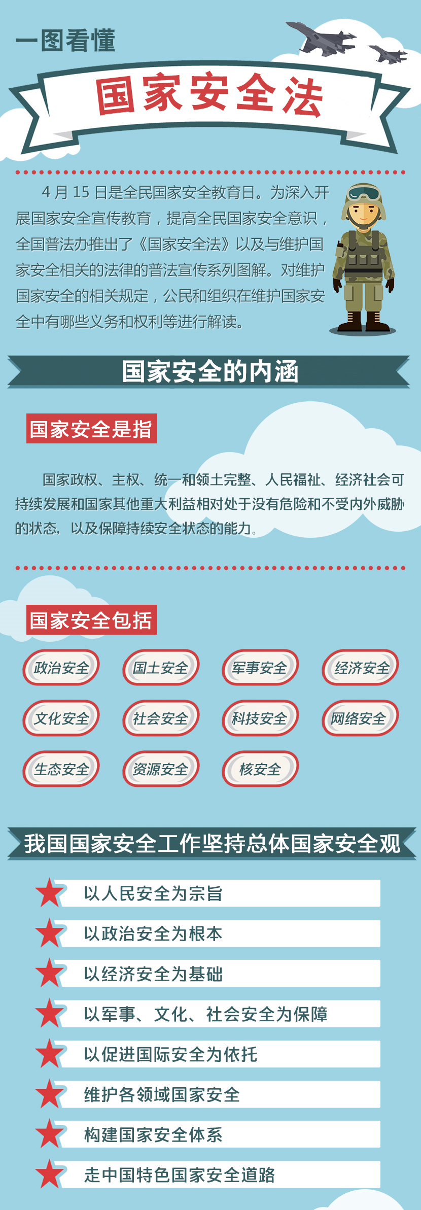 第三条 国家安全工作应当坚持总体国家安全观,以人民安全为宗旨,以政治安全为根本,以经济安全为基础,以军事、文化、社会安全为保障,以促进国际安全为依托,维护各领域国家安全,构建国家安全体系,走中国特色国家安全道路。