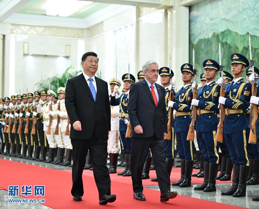 会谈前,习近平在人民大会堂北大厅为皮涅拉举行欢迎仪式。彭丽媛、丁薛祥、杨洁篪、白玛赤林、王毅、刘奇葆、何立峰等参加。