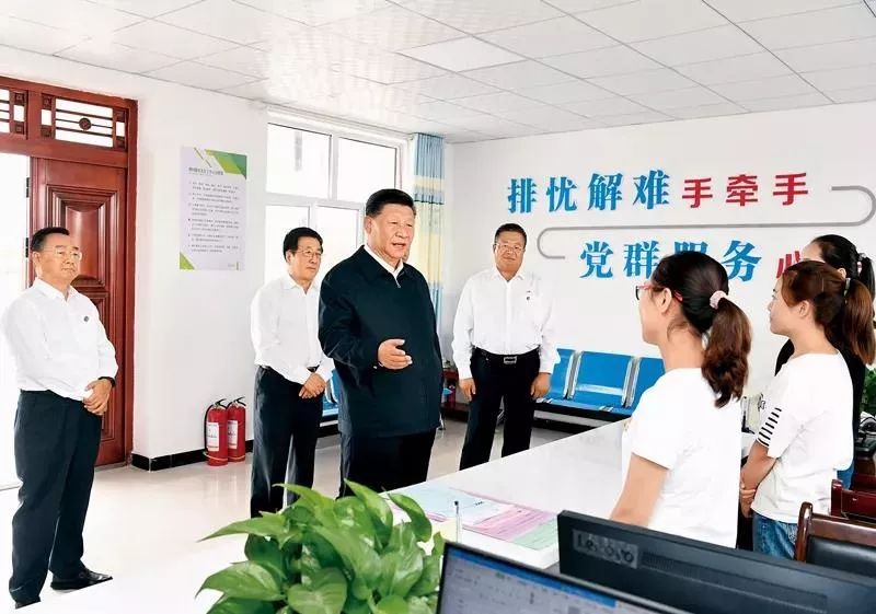2019年8月19日至22日,中共中央总书记、国家主席、中央军委主席习近平在甘肃考察。这是21日上午,习近平在武威市古浪县黄花滩生态移民区富民新村党群服务中心考察。新华社记者 谢环驰/摄