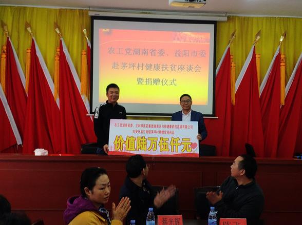 在捐赠仪式上,湖南正和祥健康药房连锁有限公司和三诺生物传感股份有限公司分别向茅坪村捐赠了价值6.5万元的药品、1.48万元的血糖仪共计100套。