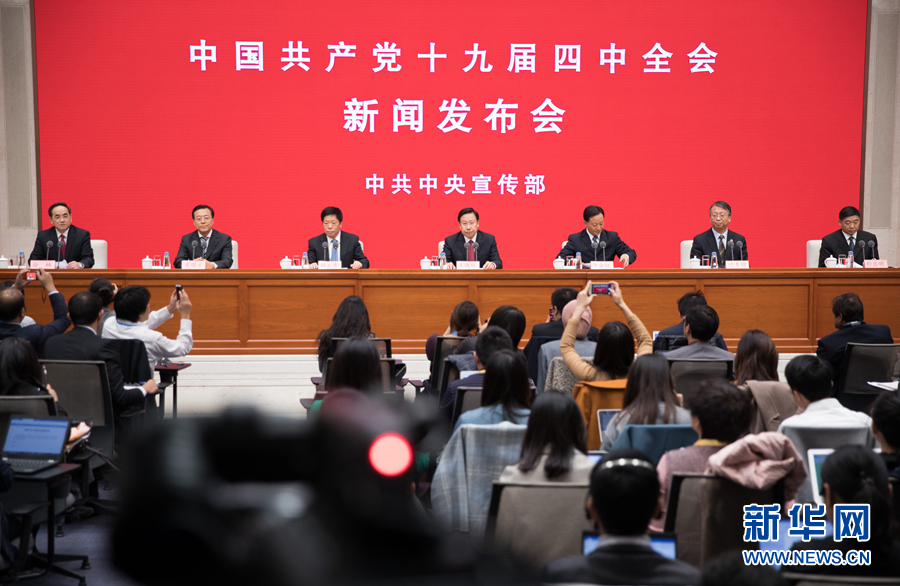 11月1日,中共中央宣传部在北京举行中国共产党十九届四中全会新闻发布会,请中央宣传部分管日常工作的副部长、中央政策研究室副主任王晓晖,中央政策研究室分管日常工作的副主任江金权,中央财经委员会办公室分管日常工作的副主任韩文秀,全国人大常委会法工委主任、港澳基本法委主任沈春耀,司法部党组书记、副部长袁曙宏,全国政协副秘书长舒启明介绍有关情况,并答记者问。中央宣传部副部长、国务院新闻办公室主任徐麟主持新闻发布会。 新华社记者金立旺摄
