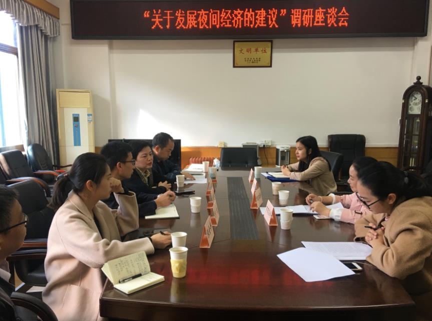 调研组一行先后在九三学社长沙市委、九三学社闵行区委的协调帮助下分别召开关于发展夜间经济的座谈会。当地商务局、城管局、交通局、市场监管局等部门代表参与座谈。与会人员分别就当地夜间经济发展的基本情况、政策、特色工作、经验建议及未来规划进行了深入的探讨和交流。