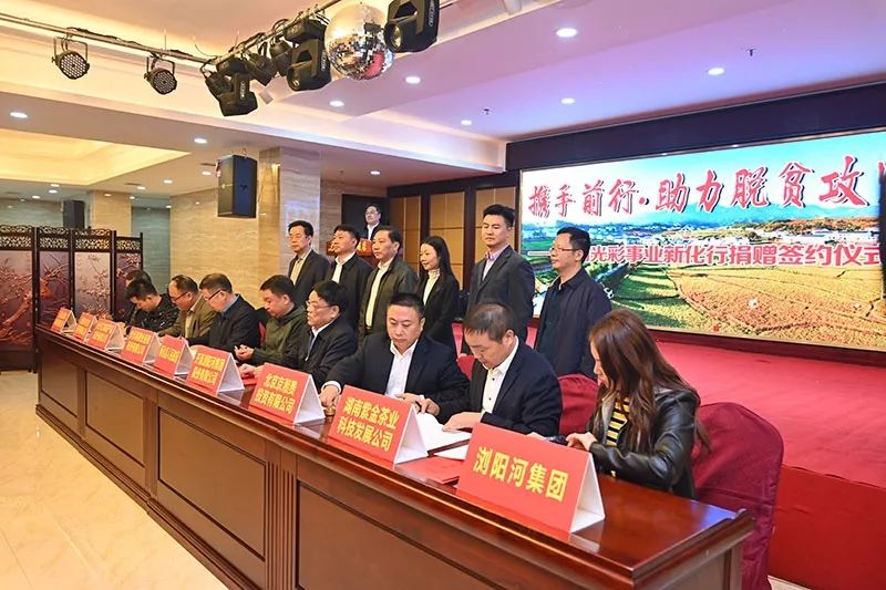 仪式现场,省浙江总商会、省山东商会、三一集团、爱尔眼科医院集团、盐津铺子食品股份有限公司、友谊阿波罗控股股份有限公司、岳麓山建设集团有限公司等企业商会进行了爱心捐赠;步步高商业连锁股份有限公司、开源浏阳河集团、长沙江城农产品股份有限公司与新化县人民政府,绿佰珍生物医药有限公司与新化县天龙山农林科技有限公司,北京京湘贵投资有限责任公司、浏阳河集团股份有限公司与紫金茶业科技发展有限公司签订了合作协议。
