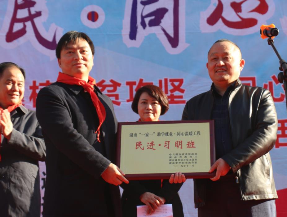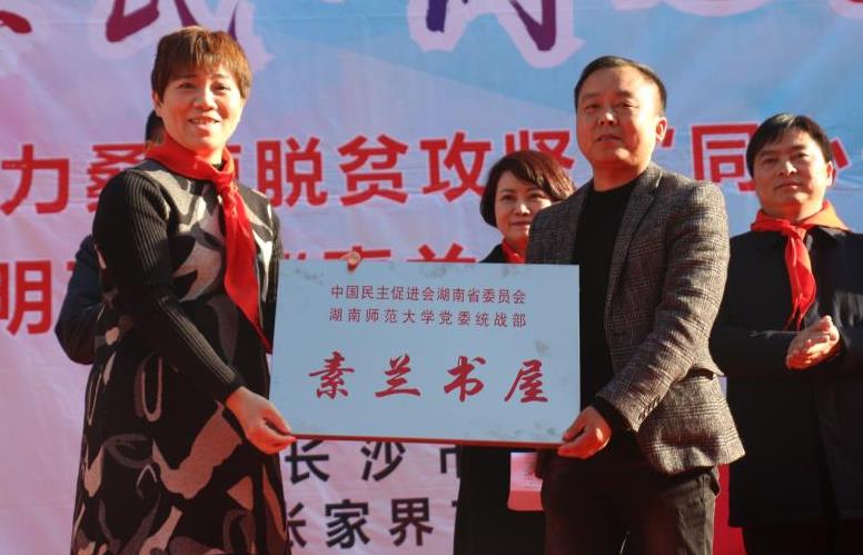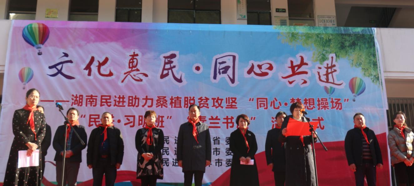 “素兰书屋”是由民进湖南省委副主委、长沙市文联主席汤素兰发起的农村学校图书建设项目,此次为汨湖小学捐赠了价值五万多元,共2000册图书。“民进·习明班”是为帮助职业中学贫困学生的教育扶贫项目,由民进会员、长沙生殖医院院长刘习明个人每年为每位学生资助生活费2000元,两年共资助4000元,并于第3年推荐就业。