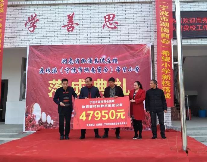 12月9日,由宁波市湖南商会捐建的溆浦县低庄镇夜珠溪希望小学新校竣工落成,宁波市湖南商会会长李迎春一行5人出席竣工典礼,并现场捐赠学习用具和用于购买体育器材和教学配套设备的资金5万元。
