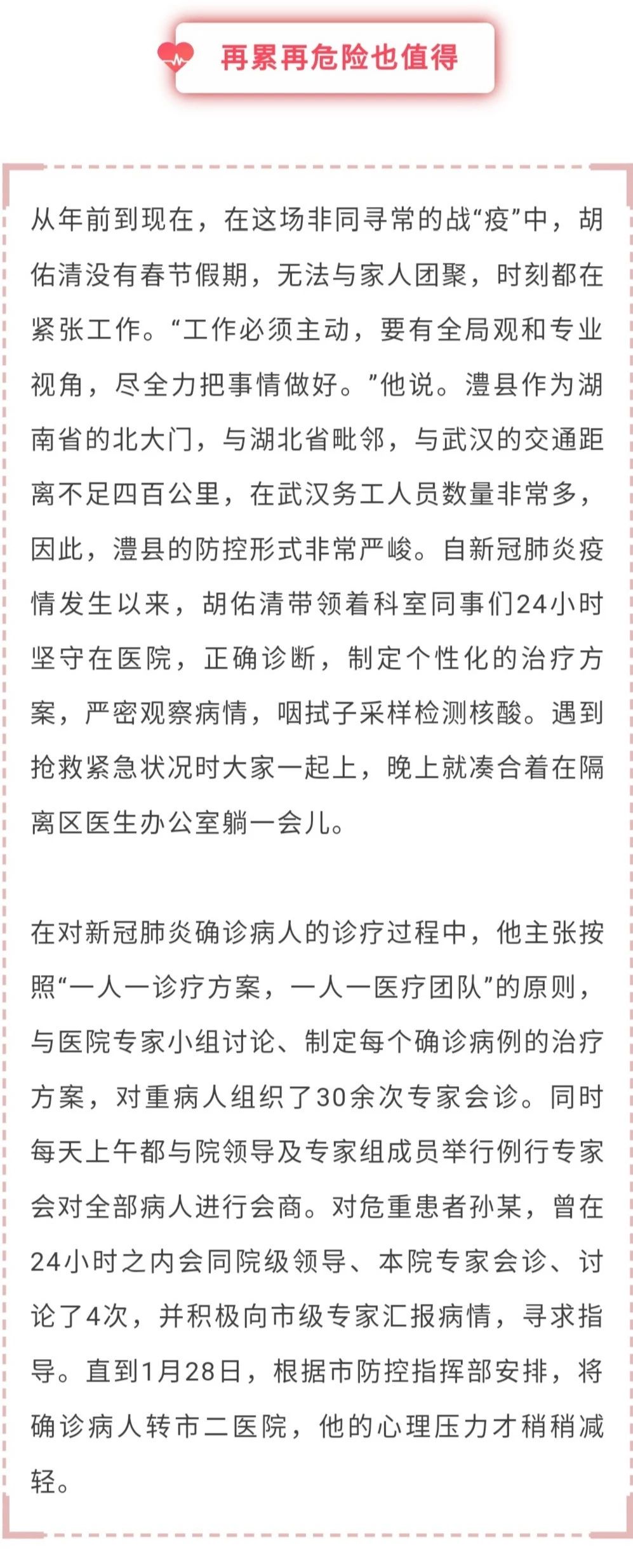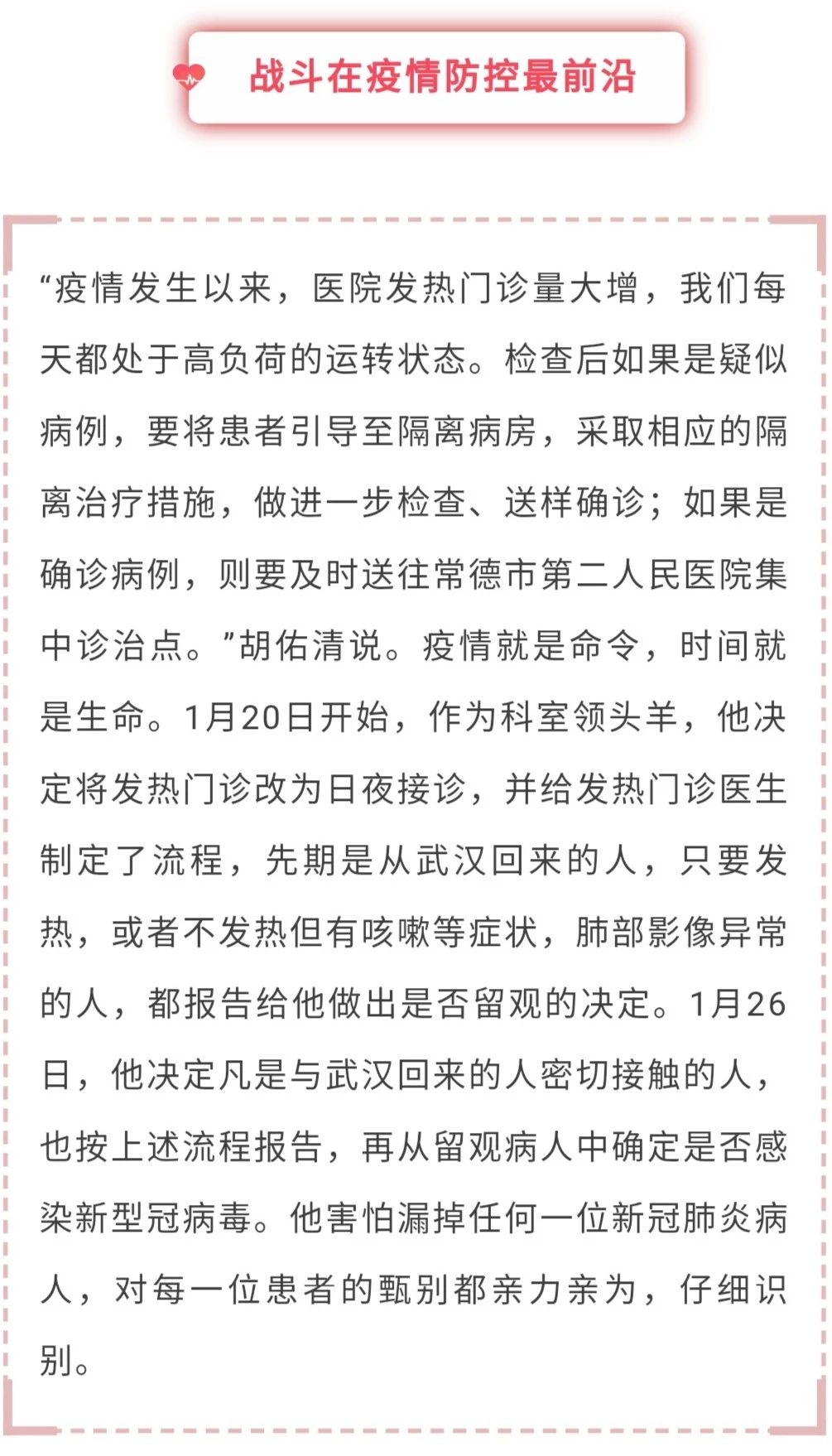澧县党外知识分子,县人民医院感染科主任、副主任医师胡佑清,今年54岁,擅长各种肝病、结核、发热查因等疾病的诊治。在这场突然的新冠肺炎战“疫”中,他首当其冲,临危受命,带领抗疫团队主动请缨,冲锋在抗疫最前线。在他的身上,我们能看到白衣战士救死扶伤的大无畏精神,更能看到党外知识分子爱国敬业,众志成城战疫情的坚定信念。