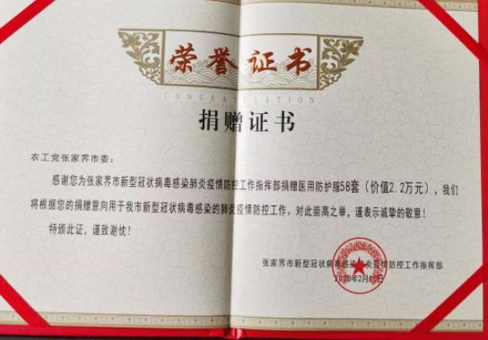 得知张家界市急需医用防护服后,农工党张家界市委会发动党员寻找货源,很快得到了农工党长沙市委会党员、湖南普瑞康医药有限公司董事长李光焰的帮助,筹措到了58套医用防护服并迅速寄往张家界。从党费上交、寻找货源到捐赠交接,前后仅用5天时间。农工党市委捐赠的防护服得到疫情防控工作指挥部物资验收人员的高度肯定,称是“专家团队”采购的高质量物资。
