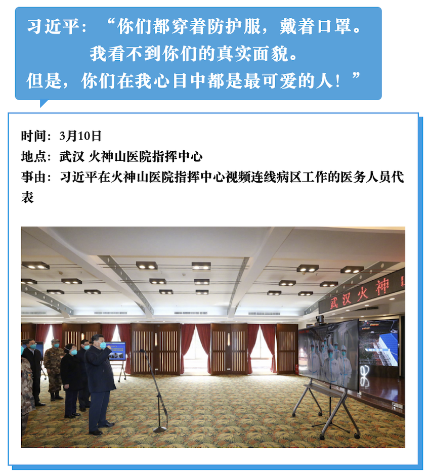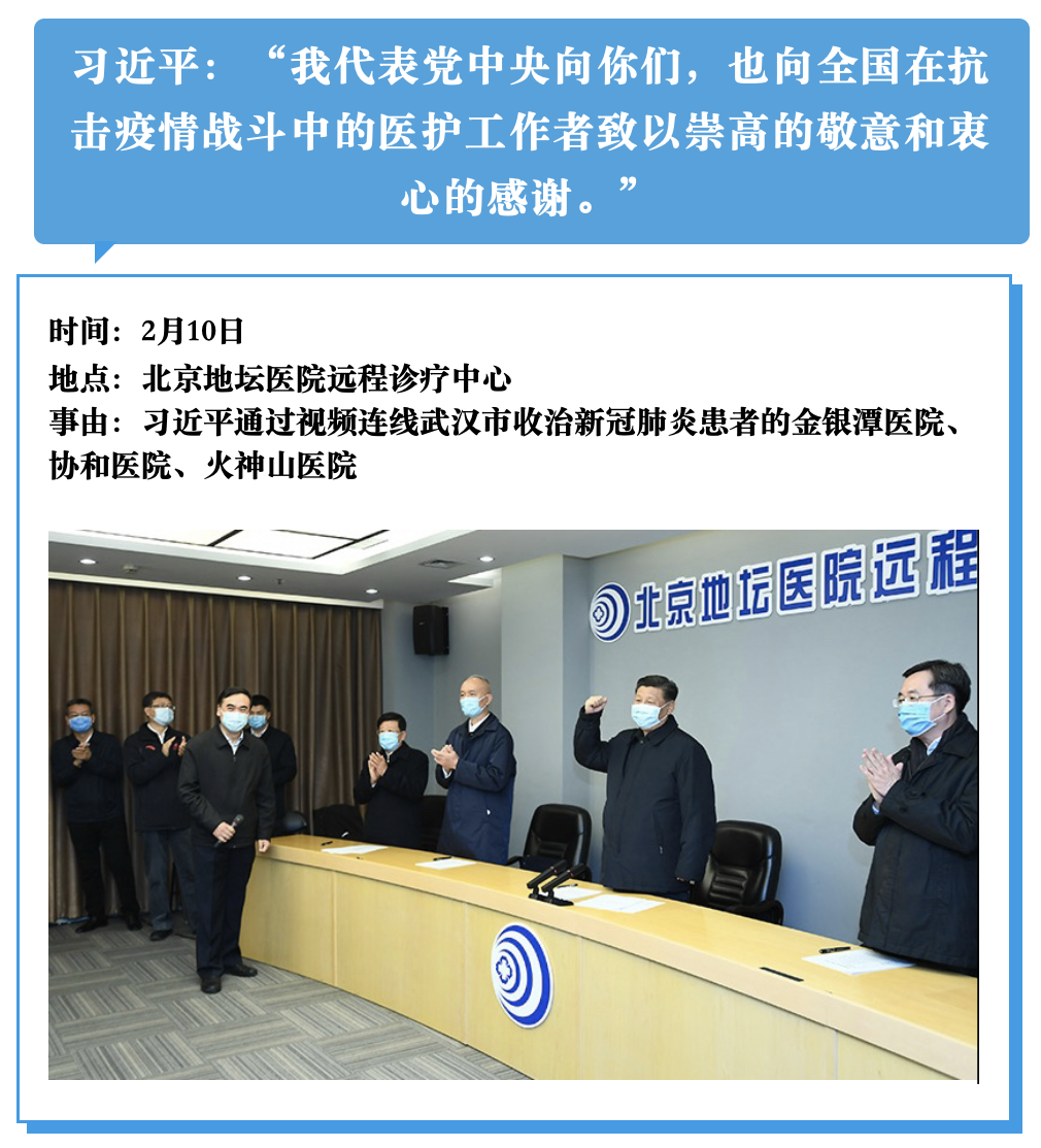 2月10日,习近平在北京市调研指导新冠肺炎疫情防控工作时,通过视频连线武汉市收治新冠肺炎患者的金银潭医院、协和医院、火神山医院,向疫情防控一线的医务工作者、干部职工和人民解放军指战员了解情况、听取意见和建议。