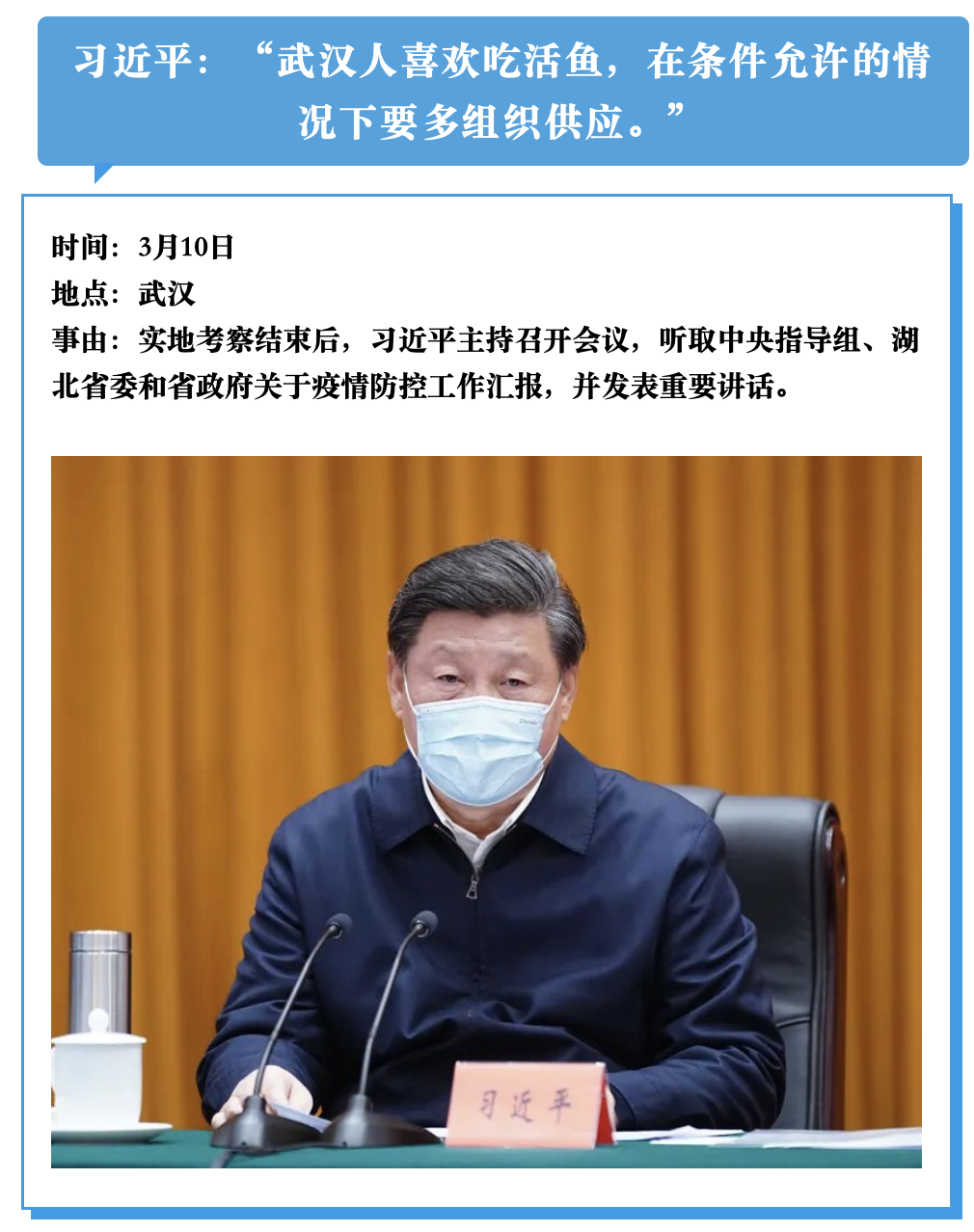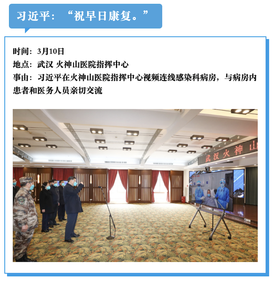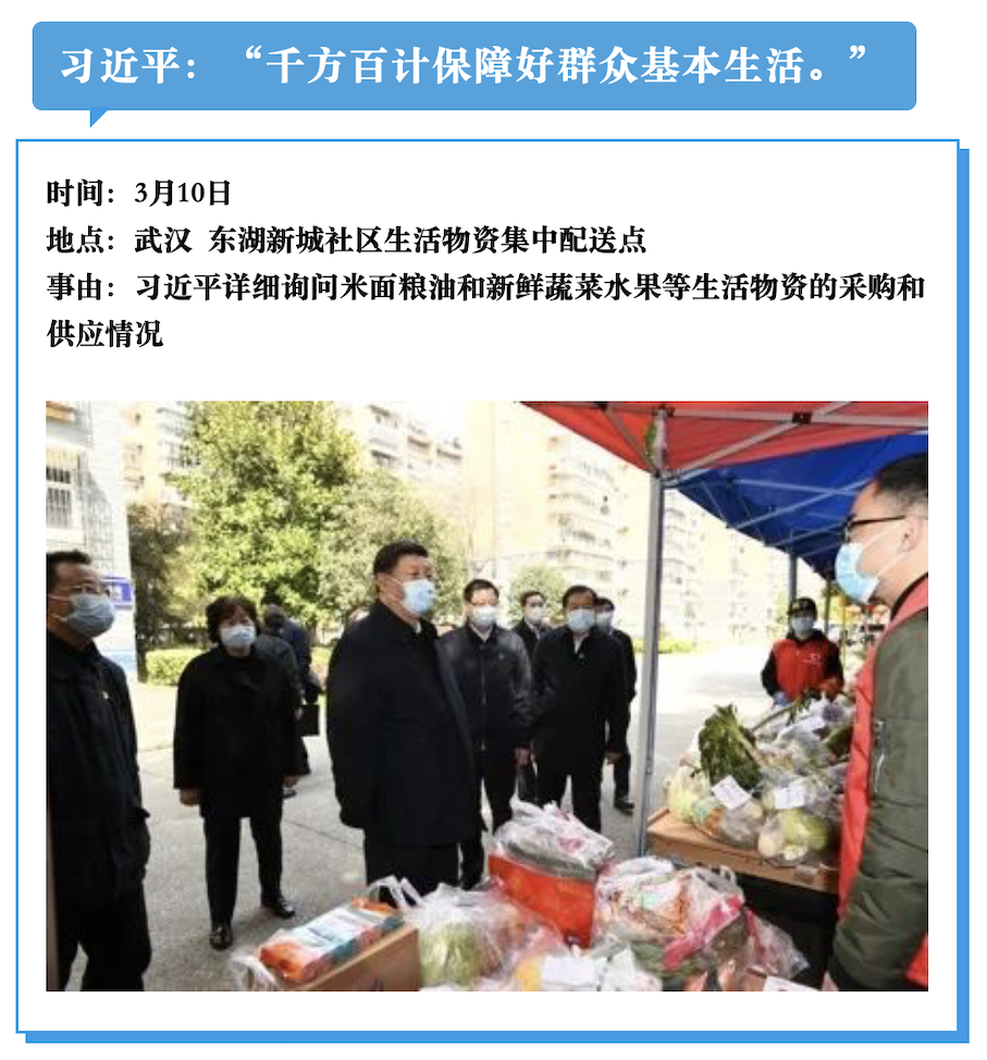 一个月后,3月10日,在抗击新冠肺炎疫情的关键时刻,习近平专赴湖北省武汉市考察疫情防控工作,看望慰问奋战在一线的医务工作者、解放军指战员、社区工作者、公安干警、基层干部、下沉干部、志愿者和居民群众。