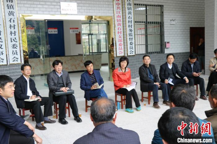 2017年4月,湖南省委常委、统战部部长黄兰香(左五)在安化县黄石村调研。湖南省委统战部供图