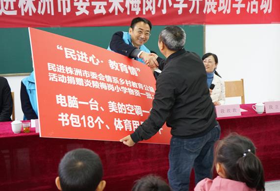 梅岗村位于炎陵县中村瑶族乡,是株洲市唯一一个少数民族自治乡,梅岗小学现有一、二年级各9名学生,幼儿园22名。活动中民进市委会联合经济支部向梅岗小学捐赠空调一台,电脑一台,为18名小学生捐赠爱心书包,为学校捐赠一批体育用品。组织邀请了市实验小学、杉木塘小学三位多次在各个层级获奖的教学骨干老师谭遥、唐瑶、黄金为梅岗小学的同学们上了音乐、美术、安全教育等三门公开示范课,并与梅岗小学的老师们开展了教学交流。