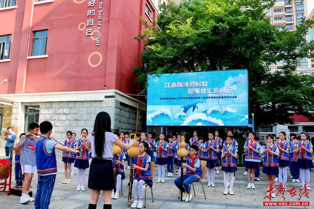 “江小豚艺术团”学生身着民族服饰演奏民族乐器巴乌。