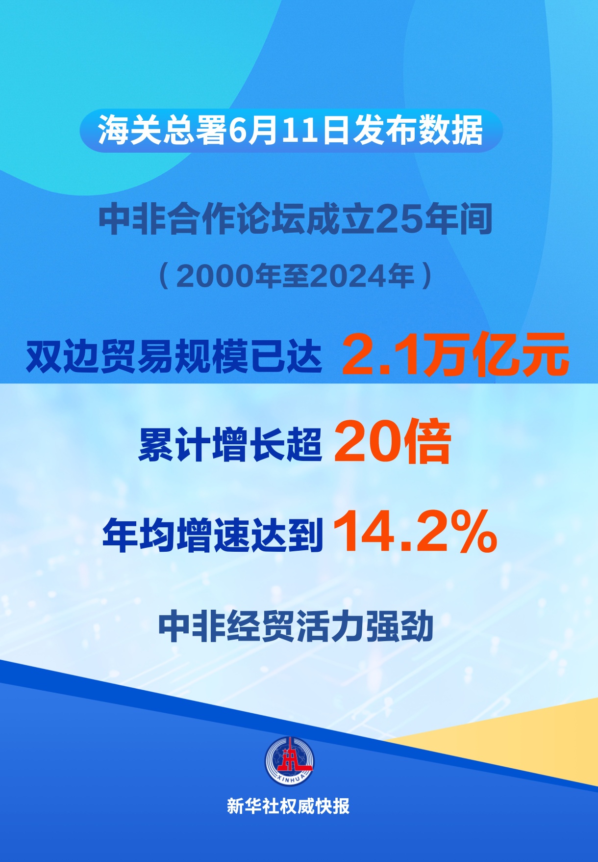 在第四届中国—非洲经贸博览会即将于湖南长沙召开之际,海关总署6月11日发布数据显示,2000年中非合作论坛成立以来,中国对非洲进出口总值由当年不足1000亿元增至2024年2.1万亿元,累计增长超20倍,年均增速达到14.2%,充分显示出中非经贸合作的强大活力。